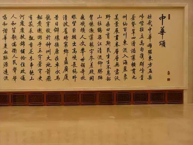 完美统一。这幅巨作镶嵌于人民大会堂中央大厅中央金色大厅内,得到国家领导人的充分肯定。《中华颂》此幅书法巨作长18米、高3.72米,每字径尺,书艺焕彩、顽铁生辉,规模空前,堪称绝品。