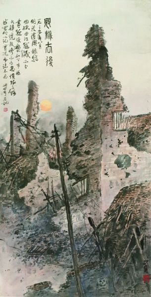 1939年8月的《寇机去后》是关山月亲历的写照,也是“再现式”描绘:敌寇战机空袭之后的城市,昔日和平的秩序被破坏殆尽,仅有断壁残垣诉说昔日辉煌,表达对日寇行径的气愤和对和平的渴求。画家细致描绘残破屋宇,可见中国画线条的表现力。断壁残垣中隐藏“(打倒)日本帝国主义”“收复失地”的标语,强化思想内涵。