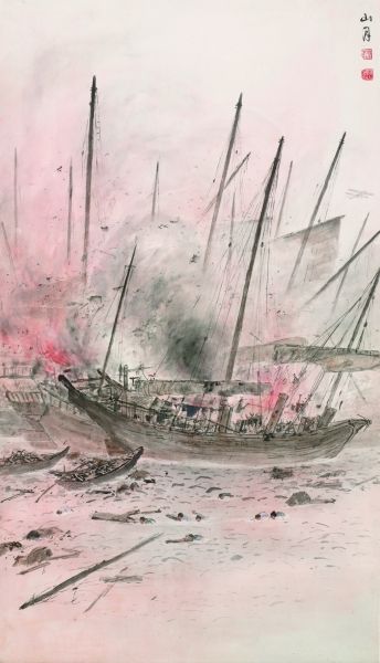 创作于1939年的《三灶岛外所见》以一种照相式的观看记录战争的残酷:右上角敌机掠过,画面主体是烟火中腾飞的木船碎片、东倒西歪的桅樯和落水呼号的船民,这些不稳定因素强化了画面的紧张感,突出了人物所处的悲剧氛围。用笔和设色上注重物体的明暗体积,没有过于在意传统的笔墨语言,专注于制造真实可信的凄惨场景,作者面对家国危亡“为国难写真”的立场显而易见。