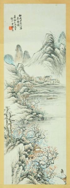 杨春此幅《山水图》94cm×33cm的直幅,设色纸本。此图应名为《探梅图》,是 “仿南田老人”的笔意。图中左边是缓坡水岸,岸边成片成片的梅树,赭石加粉和纯白粉碎点花朵似飞雪满天,瘦态霜姿,梅雪争春,有“梅须逊雪三分白,雪却输 梅一段香”的诗意。图中右边是静静的一汪湖水,波纹不起,澄碧洁净。岸边一叶直插竹篙的小舟静静停在那里,野渡无人,万籁俱寂。远景的山腰间几间简易的茅 屋,也是不见人迹,清寂荒疏。高远的山峰披麻皴写,碎点成片的水墨和花青苔点,苍郁高深,鸟迹也难至矣。画的点睛处,是右下角一位策杖高士顶着寒风要去探 梅,高士虽然眉目不清,但超迈脱俗的神态还是被画家跃然纸上。“雪满山中高士卧”,是否被梅花掩映的楼阁中有高士在等着这位策杖高士去访问?高士相见,煮 酒吟诗,谈书论画,是何等的自在呀!