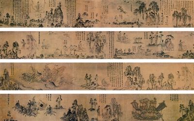 顾恺之的《洛神赋图》为人物画之经典,目前考证是出自宋摹高手,造型古拙而具当时精细巧艺之神彩。洛神本人的美女造型自是魏晋时期的特征,車驾、神兽、鸾马、旌旄、深涧、坡岸、树木、细草……都能达到出神入化的境界,与同时代稍后隋展子虔《游春图》的山水人物关系比例和表现手法非常接近而精美过之。尤其是魏晋时期山水画初兴时“人大于山,水不容泛”的构图特征,通过摹本一丝不苟地忠实描摹,被体现得淋漓尽致。但我以为更重要的是:这是古代中国画史中第一个以文学作品为底本进行主题创作的记录。《洛神赋》出自文学家曹植之手,为名家名篇,它是先在的,本身与绘画史无关。画家把它引入自己的创作,既不能学明清水墨逸笔草草遣兴抒情不得要领,又不能像汉人画像石中述孔子老子周公故事必须非常忠实于历史。《洛神赋》出于曹植的虚构与想象,本无其事,取为题材也是显示文学家的才情而已,与历史事实并无关涉。而顾恺之取之为画,必须吃透原意、反复比较、认真表现之。这就是我们今天所说的“主题性创作”。历来多见的《竹林七贤图》《兰亭修禊图》《西园雅集图》《虎溪三笑图》都属此类,在中国绘画史中向来不重写实的传统制约下,它们的偶尔出现,是弥足珍贵的。它不是工匠画,更不是文人画,可惜这卷故宫藏《洛神赋》是宋摹本,若是顾恺之原迹,那该创造多少个第一纪录啊?