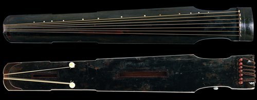 通长118.7、隐间110.3、肩宽18.3、肩厚4.7、尾宽13.5、尾厚4.7厘米。仲尼式,面桐木底梓木;通体黑漆隐现红光,琴面为大蛇腹断,琴底为流水断,鹿角灰胎;蚌徽,红木岳尾足,足底呈喇叭形;长方形池沼,内纳音微拱。