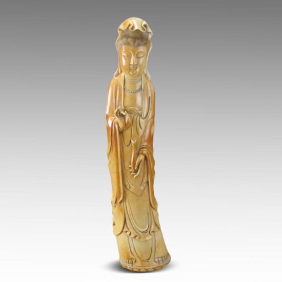其次,从雕刻品的艺术风格来辨别。如清初雕刻的观音像,衣纹线条简练,有明代牙雕的遗风。由于深浅刀法并用,圆浑而挺拔,衣着线条下垂而坦然,给人以沉稳的感觉。近代仿制的观音像,衣纹线条繁复,立体感不强,刀法也软弱。另外,“旧料新雕”也颇为多见,同时也要注意款识辨析,“后加款”的作伪方式频繁,最后还需要提防名家牙雕作品的仿冒品。