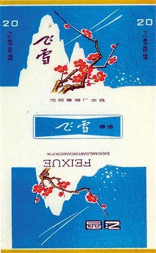 “梅须逊雪三分白,雪却输梅一段香”,出自宋代诗人卢梅坡的《雪梅》,该诗表达出诗人对于雪和梅极致的喜爱,诗中的雪因为梅而更显纯净,而梅则因雪更显其高尚的品质。沈阳卷烟厂上世纪70年代出品的“飞雪”烟标,其画面就具有《雪梅》的意境。主版上巍巍的雪山、飞舞的雪花和横出的两枝梅花相映成趣,而深红色“飞雪”两字书写在雪山上,增添了飘逸之感;副版同主版大致相同,只不过成了一枝梅花,“雪山”二字书写在梅枝的顶端。此烟标设计朴素,对比明显,能体现出雪和梅各自特点,让观者心旷神怡。