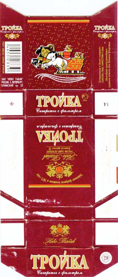 ④俄罗斯一家烟草企业上世纪九十年代出品的“ТРОЙКА”(三套车)烟标。