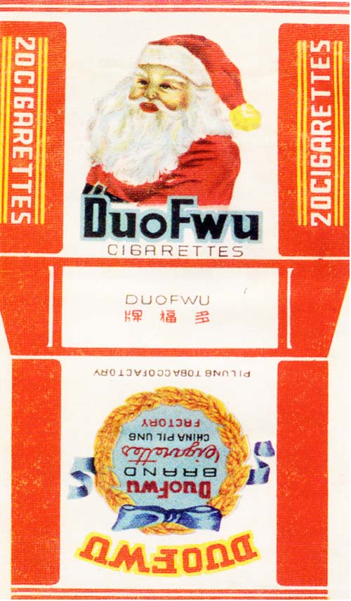 圣诞老人的形象还见于上世纪40年代上海仙乐烟厂股份有限公司出品的“乐口福”烟标(图②),以及辽宁沈阳毕隆烟厂出品的“多福”(图③)等烟标上。