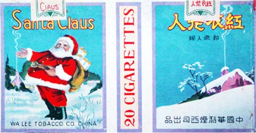 早在上世纪40年代圣诞节就漂洋过海来到我国,这可从当时烟草企业出品的烟标上看到一些印记。如中国华利烟公司出品的“红衣老人”烟标(图①),主版图案展现的就是身穿红衣头戴红帽的圣诞老人形象。尤为有趣的是,这个圣诞老人的背包里装的并不是玩具,而是一支支卷烟。