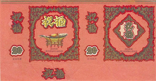 ②贵州省烟草公司出品的“祝福”烟标展现了一条放在金盘中的鱼,传达富贵有余的寓意。