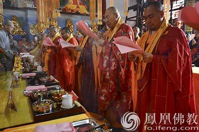 诸位高僧大德虔诚顶礼诸佛菩萨,为龙王宝寺祈祷,为众生加持。(图片来源:凤凰佛教)