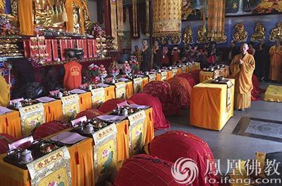 开光庆典仪式正式开始,诸山长老和法师,以及各级领导主席台就坐。(图片来源:凤凰佛教)
