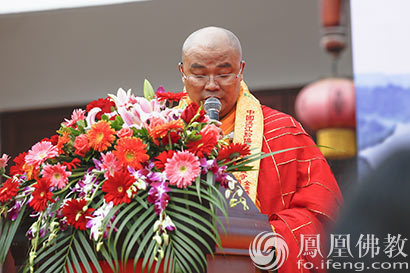 中国佛教协会常务理事、湖北省佛教协会副会长、湖北省襄阳市广德禅寺方丈圣君大和尚代表诸山长老致祝贺词(图片来源:凤凰佛教)