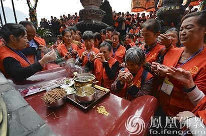 居士义工们排队拈香(图片来源:凤凰佛教)