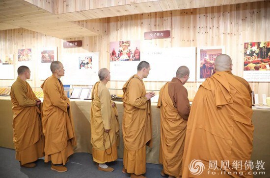 僧众参观《正法久住 砥砺前行》展(图片来源:凤凰网佛教 摄影:上虞多宝讲寺)