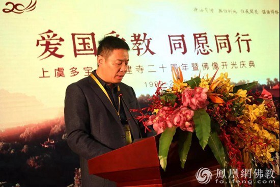 浙江绍兴上虞区统战部副部长、民宗局局长傅春荣发言(图片来源:凤凰网佛教 摄影:上虞多宝讲寺)