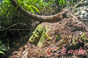 佛像的五官藏于断木下。(资料图片)图/广州日报记者何波