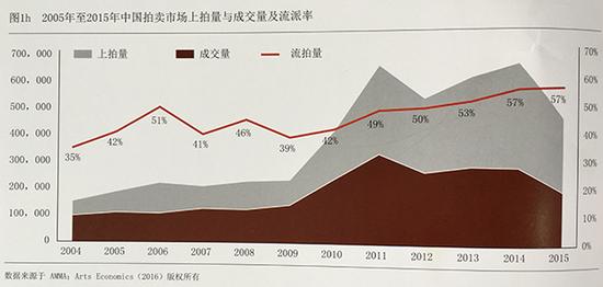 自从2012年以来,艺术品的市场投放量和实际销售量之间的差距越来越大。从2012年到2015年,艺术品上拍量下降了14%,成交量下降了26%。2015年,艺术品上拍量跌幅达到30%(史上最大跌幅),艺术品流拍量也达到57%。
