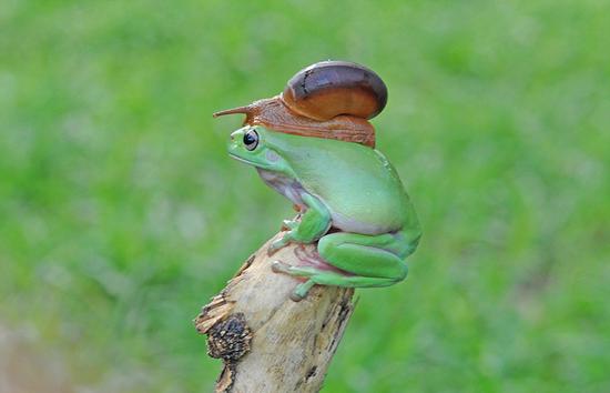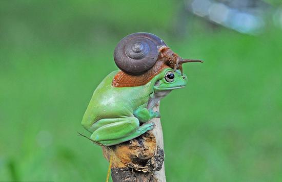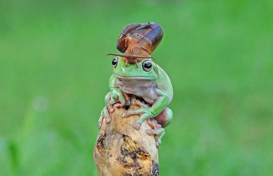 日前,摄影师在印度尼西亚雅加达一个小公园捕捉到“牛蛙合体”的画面——一只蜗牛栖息在一只白氏树蛙头上,画风奇特。 这只蜗牛从树蛙的背部慢慢爬上其头顶,留下一道爬行的痕迹。蜗牛成功“登顶”后不久,便被摄影师拍下这个画面。 树蛙似乎被新朋友弄懵了,停在树桩上一动不动。而这只调皮的蜗牛好像还有些“得寸进尺”,它低下头,想端详一下新朋友的脸。 摄影师称,这并不是他第一次拍摄到“牛蛙合体”的奇特景象。去年,他也曾在自家后院捕捉到类似画面。 作者:汪燕妮 郭思佚