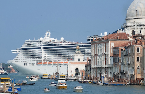 豪华游艇正在驶离威尼斯的港口由于反对游艇进入市中心的抗议活动不断升级,联合国教科文组织(Unesco)最终在2014年向威尼斯市政当局发出警告,如果他们不能提交一份令人信服的方案来保护环礁湖,会将威尼斯添加到濒危遗产名录中。但事实上,允许游艇进入威尼斯仅仅是市政当局城市和环境管理不善的一个缩影。2013年,负责建设防洪工程的公司爆发大规模贪污丑闻,包括市长在内35人被捕。工程总预算在2003年只有34亿欧元,但到2014年已经上升到55亿欧元,贪污至少使工程预算上升10亿欧元。该工程预计于两年内竣工,将保护城市免受特大洪水的侵袭,但对不断上升的海平面却束手无策。如果不能有效遏制海平面上升的趋势,威尼斯将成为气候变化的第一批受害者。