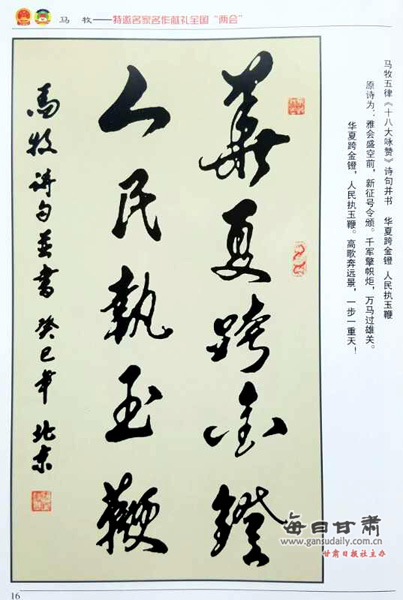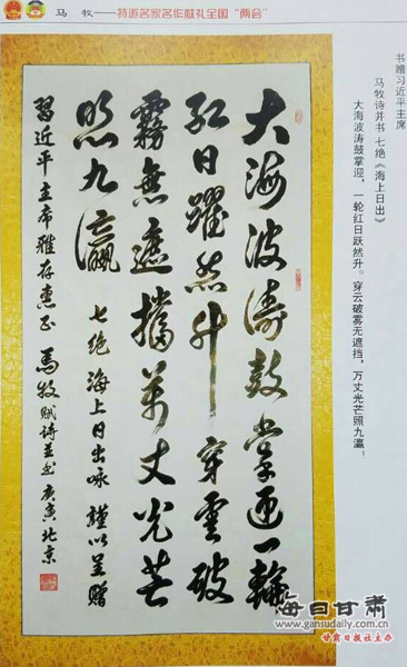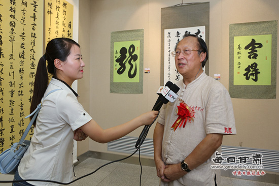 记者在会场见到了从甘肃走出去的著名诗人、书法家马牧先生。毕业于兰州大学中文系的马牧先生,曾任中国民进甘肃省委常委,甘肃人民出版社(《语者》出版集团)副编审。现为中华诗词学会顾问,中國国家书画院副院長,人民书画院荣誉院長,国务院国宾礼艺术家,国家一级书法家。被业界人士誉为“诗书同辉第一人”,曾得臧克家、艾青、赵朴初、王洛宾、启功、欧阳中石等一代大师的高度评赞。许多专家和媒体对马牧先生的评价是“诗接千古,唐韵十足”“诗书双绝,独树一帜”。因着在甘肃学习、工作过的经历,马牧先生对甘肃怀有深厚的感情,这次更是带来了精品之作,在接受众多媒体采访时马牧先生说“甘肃具有深厚的文化历史底蕴,是一片艺术创作的热土,今后要不遗余力地推介甘肃,让全世界了解甘肃”。