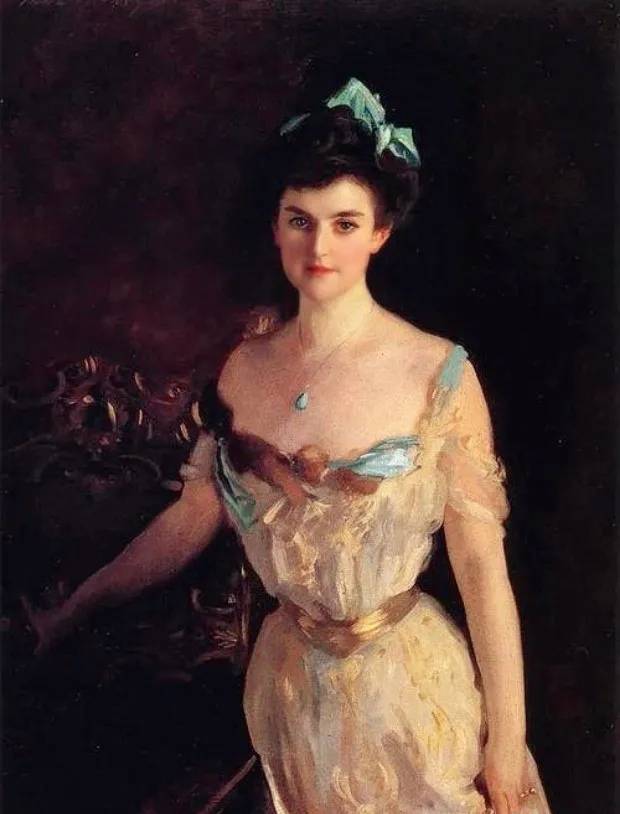 她身穿一件绣有金色花纹的白色长裙,宛如出水芙蓉,优雅而高贵。腰上系着一条金色腰带,凸显出她纤细的腰身。胸前、左侧肩部和头上装饰着浅蓝色丝带,增添了几分柔美。颈部佩戴一条绿松石项链,与白色长裙形成鲜明对比,更显她的高雅气质。
