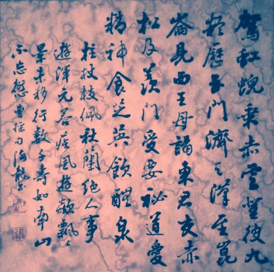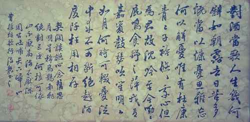 张海龙先生的三幅作品取法比较广泛,整体布局精思缜密,书写流畅,气息和平内敛。用笔中锋不苟,运笔起止有度,节奏感很强,笔笔交代得非常清楚,对点画用有较强的把控能力 。第一幅作品“驾虹蜺”……,笔墨饱满,书写从容而就,一气呵成,轻重缓急自然得当,是一幅精美的作品。如把后面小字部分的底部往上提到“南”字的位置,可能看着舒服些。第二幅“东临碣石”……,把章法分成两部分,前半部分取竖势,后半部分取横势,形成了一个横竖对比的格局。画面空灵透气,艺术效果较强。第三幅“对酒当歌……,”横幅,也是把一首诗分成两部分处理,大字部分为主基调,小字部分为副基调,把副基调作为落款形式处理,看上去显得很自然,这也是记过设计的,也可说是“巧思”,确实是花费心思的了。如把小字部分适当的上提一下,再错落处理,可能整幅作品就不会显得过于“塞满”和“呼吸紧张”。