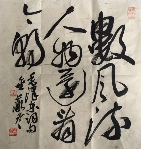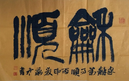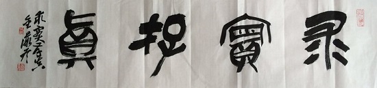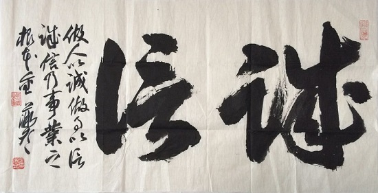 在我国的书法史长河中,曾经出现过不少卓有成就的女性书法家,从魏晋时期的蔡琰、卫夫人,到唐代武则天,又有元代的管道升,直至现代的萧娴等,无不影响着一代代的书法后人。证明女性也可以写出漂亮的书法来。金薇冬先生虽是女性,可其作品中看不到女性的阴柔之气,气势完全不让须眉,且技法、章法及气韵都处理得很合理,包括线条动静的把控能力都已经达到了一定的高度且各体兼备。其中“求实存真”,篆书作品轻松流畅,自然放松,虚实处理得当,可归于草篆一类,“实”字的左下有些下赘。第二幅草书“数风流人物”……,写得自然奔放活泼灵动,不泥古法一气而下,很有气势。如能把行距拉开些看着会更舒服。第三幅篆书“和顺”,横写正文,把小款写在下面,把上面一下托住,显得稳重多了。第四幅草书“诚信”二字,让人眼前一亮,虽尺幅不大,但艺术效果十分明显,给人向前冲的感觉,张力十足。很难相信是位女性所写,小字落款灵动可爱,自然活泼,与“诚信”二字形成了一对矛盾统一。相信在不久的将来金冬薇女士会创作出更加精彩的作品来。