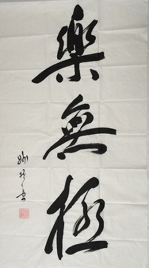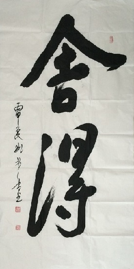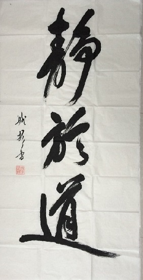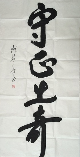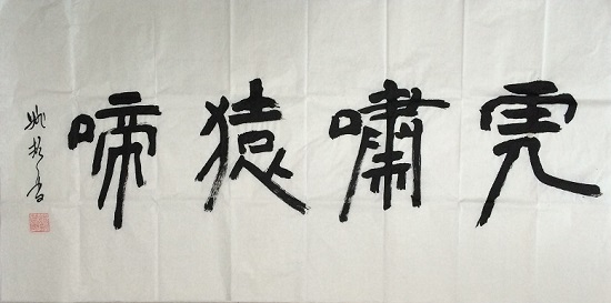 姚振普将军善行草书,犹爱写大字榜书,且很有艺术特色,具有丰富的变化和极强的个性,随字赋形,随形赋意。如四尺整幅“舍得”,动中有静,收放有致,欲动还休,弘一法师最爱此法,落款如再重些可称完美。“乐无极”三字写得潇洒恬淡,飘然欲仙,似微风拂面,“乐、无”二字的横画如船夫荡桨,结构中宫内守,艺术效果十分明显。“守正出奇”四字特点明显,作品虎虎生威,笔墨凝练,看上去似乎很黑,但不显憋闷,正是“疏可走马,密不透风”。其在意料之外,又在情理之中,其“守”字和“奇”字的竖钩似是建筑大厦的上下梁柱,大有临危不惧之感。“静于道”三字,似乎是道家之仙风道骨,潇洒自然,犹如一阵清风徐徐而来。三个字收放十分合理,“静”字长,“于”字短,而“道”字最后一笔上面所有的笔画都托住,且推向远方,构思十分清楚。“虎啸猿啼”用篆书笔意写隶书的味道。中锋用笔,线条厚实而每字书写得轻巧活泼。写篆书最容易写死板,而此幅作品反而感觉特别轻松。如“虎啸”二字的左下一笔,取斜势,使作品顿时活了起来,增添了许多生机。