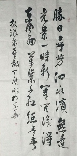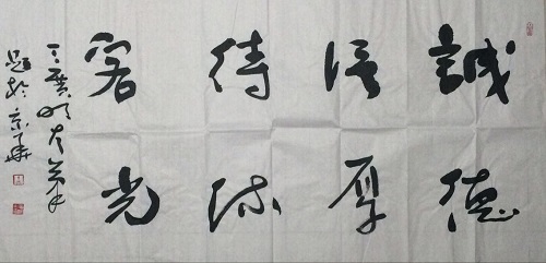 丁广明老师的书法新作,在继承传统技法的基础上,凸现个人情趣,追求古拙而自然的艺术风格。用笔流畅不饰雕琢。其行草书富有隶意,增强古趣。其隶书则多行书笔意,灵活多姿。更由于其左右手均能挥毫,常能出奇。向丁广明老师学习。