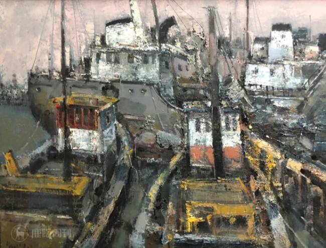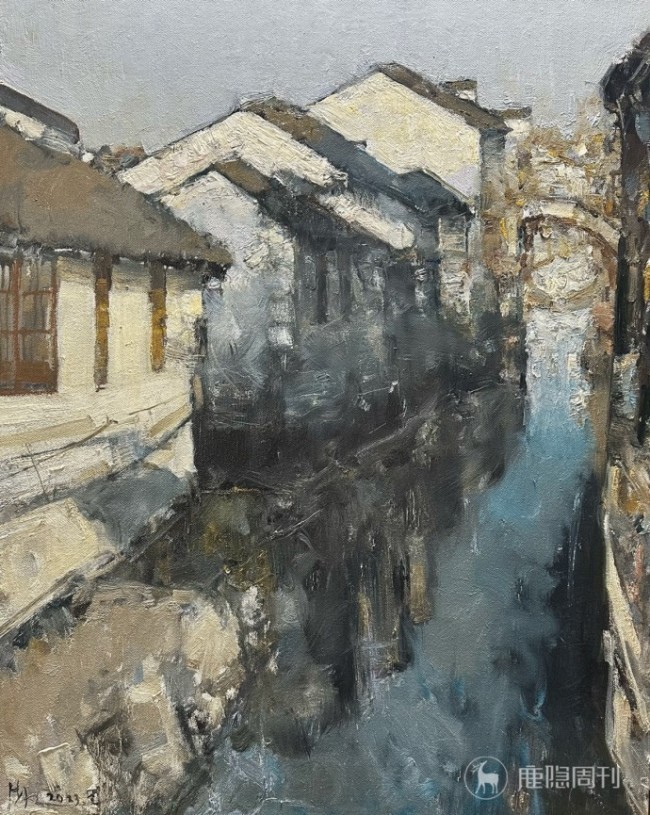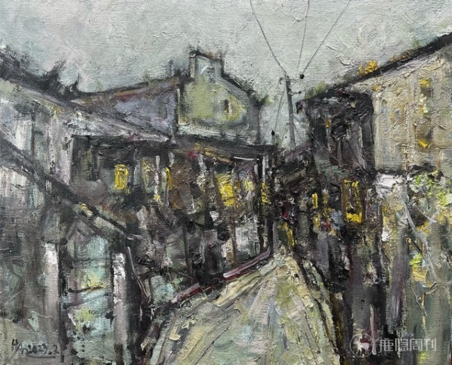 他的色彩表达,始终遵循着一种温润而克制的美学秩序。那些看似沉郁的灰调、柔和的间色,并非单调的铺陈,而是经过反复调和与斟酌的语言,如旧书页间晕开的墨痕,带着时光沉淀的雅致与沉静。他从不刻意追逐明艳的张扬,却总能在微妙的色阶过渡中,赋予画面呼吸般的节奏,让冷调的清寂与暖调的柔婉彼此渗透,于不疾不徐的铺陈里,晕染出足以安放情绪的氛围。无论是天光漫漶的街巷,还是潮声渐息的港湾,色彩都褪去了生硬的边界,在油彩的交融里化作朦胧的情绪,让观者在沉静中触摸到风物背后,属于江南的温润底色与都市的隐秘呼吸。