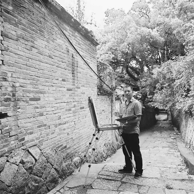 李晓伟在青石板小巷创作油画,“留住”老仓山之美。