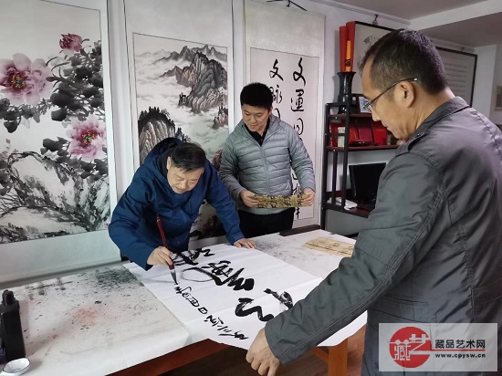 李明(中)与武警部队原政研室主任陈从本教授、军委联合参谋部某部现役领导一起在将士丰采书画院北京院笔会活动