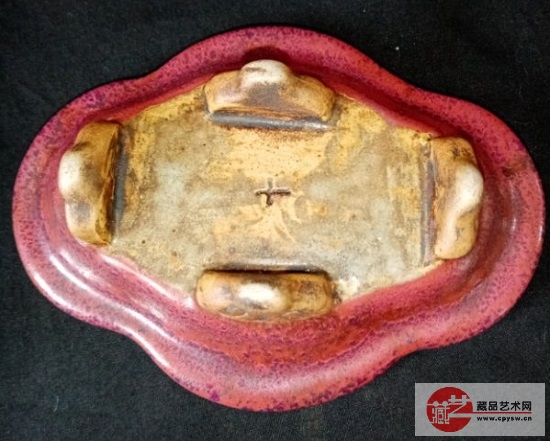 宋代均窑——玫瑰红色花口洗(背面) 藏家描述:此宋代均窑玫瑰红色花口洗。高4.5公分,长16公分,宽12公分。本藏品包浆温润白然,老化痕迹明显,蚯蚓走泥纹自然生动咔啡色护胎计正正统自然。十分难得的宋官均。