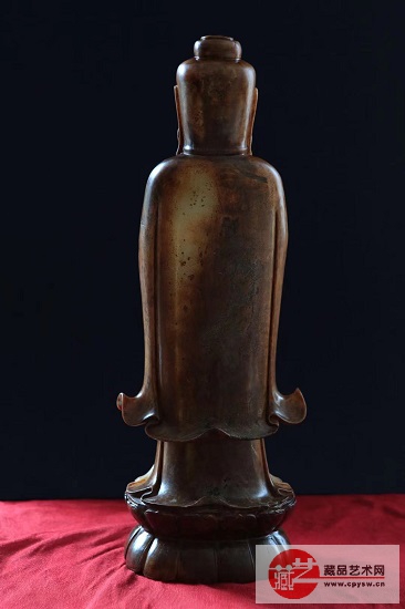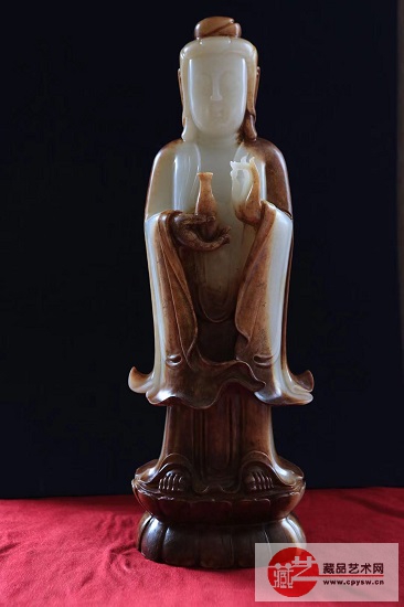 这是一樽十分罕见的隋唐时期和田白玉观音像。 尺寸硕大,高48公分,宽16.5公分,厚11公分。 该佛像玉质油润细腻,质地坚硬,皮壳油润老熟,沁色过渡自然。除脸部及胸部外,其余部分都有不同程度的棕褐色沁,整个背部出现钙化现象。 此佛像呈站立状,面像饱满,体态安祥,莲座厚实平稳,衣着合度,曲折有形。