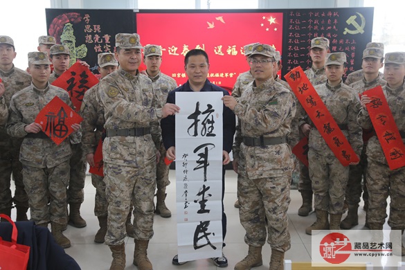 ▲2024年2月1日上午,北京市大兴区旧宫镇政府领导和将士丰采书画院艺术家来到北京卫戍区某部营区,开展写春送福拥军慰问活动,受到驻地官兵们的热烈欢迎。 在写春送福活动中,藏品艺术网总编辑、将士丰采书画院负责人王鑫平同中国书协会员、将士丰采书画院副院长张成银,中书协中直机关北京书协会员、将士丰采书画院顾问韩山林,中国书协会员、将士丰采书画院理事、军旅书法家赵俊生大校,以及旧宫镇黄桐麟老先生等一起,分工合作、挥毫泼墨,现场书写多幅“福”字春联和书法作品,为部队官兵送上龙年新春的诚挚祝福。