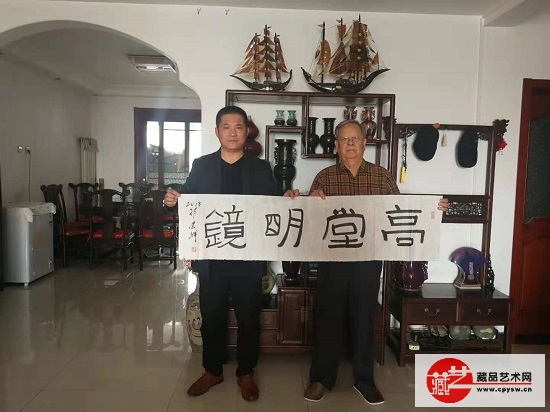 藏品艺术网总编辑、将士丰采书画院执行院长兼秘书长王骊丁(左)与藏品艺术网和将士丰采书画院名誉顾问祁荣祥将军(右)在“高堂明镜”作品前合影