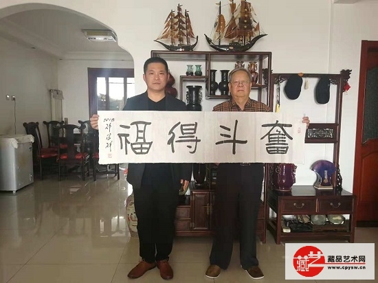 藏品艺术网总编辑、将士丰采书画院执行院长兼秘书长王骊丁(左)与藏品艺术网和将士丰采书画院名誉顾问祁荣祥将军(右)在“奋斗得福”作品前合影