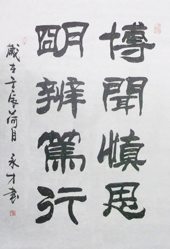 施永才 字金河 ,号方人也,汉族,江苏启东人。中共党员,长期从事解放军总部机关和部队的宣传文化工作,现任中国人民解放军总参谋部某部副部长,大校军衔。定居北京。 施永才1962年出生在长江尾头的东海之滨,滔滔江水铸就了豪放的秉性,吴越人文赋予了艺术的灵气,艰难的家境磨练了他坚韧的性格。天资聪颖,敏而好学。自幼酷爱艺术,涉足于文学、书画、音乐、摄影,具备良好的天赋和超常的临摹能力,中学期间其画作就小有名气。1981年10月入伍后,潜心攻研书法,三十余载临池不辍,研习多种碑帖,传统功底扎实,在书画方面曾得到陈维信、刘炳森、李铎、苏适、启镶、张济海、李洪海、米南阳、魏恒斌、王学嶺等名家的耳濡目染。崇尚师古入法、内外兼修,他除了痴情临碑摹帖和虚心求教之外,注重从历史、哲学、文学、诗歌、音乐以及绘画、篆刻、刺绣、剪纸等艺术门类中汲取营养、得到启发,加强对书法理论的研究创新,精通楷、行、隶、草等多种字体,追求书法的动态变化和个性张扬,逐渐形成了雄浑朴茂中蕴含灵动秀美的艺术风格。近几年,尤其得到了国学大师、著名艺术评论家巴.钢普力布的多次点拨和指导,系统学习研究中国传统文化。 军营生活对艺术的滋养,练就了其刚毅、正直的性格,秉持求真达观、宠辱不惊的操守,与人为善,谦和朴诚。新世纪以来,关注历史变迁,勇立文化潮头,在创新书画艺术、构建艺术鉴赏评价体系和规范文化市场等研究方面,提出一系列真知灼见引起业内注目,在新闻和文化界享有一定知名度。强调书法的魅力在于寓教化、传情、实用于一身,旨在传承文明、直抒情感和讴歌时代、弘扬正能,极力推崇公益书法。上世纪九十年代起,多次参加全国各类书法大展和慈善义拍活动,有的在军内外书法大赛中获奖,各类报刊上发表作品数百幅,近千幅作品被国内外政要、艺术名流、历史纪念馆和广大书画爱好者收藏。现为中广学会广播军事协会理事、中国长城书画院理事、中国期刊协会理事、藏品艺术网书画艺委会理事、中国扇子艺术学会会员兼创作中心副主任、中国艺术家协会书画研究会副秘书长兼大型活动策划指导、中国少林寺书画研究会常务副会长、中国青年文艺学会书画专业委员会主任、中艺财富文化艺术品投资管理中心审定委员会常务委员。 作品欣赏: