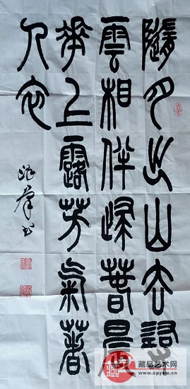 刘泽群先生篆书王安石诗《山中》“随月出山去,寻云相伴归。春晨花上露,芳气著人衣。”