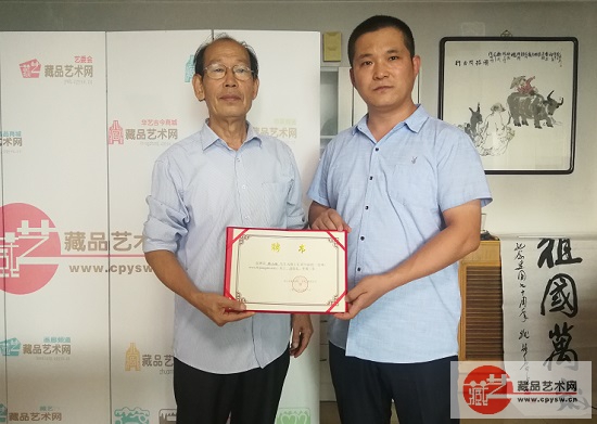 将士丰采书画院负责人王景轩向韩山林(左)颁发聘书,聘其为该书画院副院长。自2018年10月18日起,任期3年。