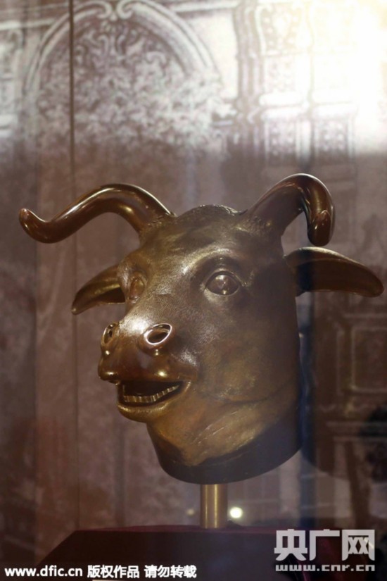 圆明园十二生肖兽首铜像,原是清朝皇家园林圆明园海晏堂前喷水池的一部分,由意大利清朝宫廷画家郎世宁设计,该喷水池称为水力钟和十二生肖报时喷泉,每到一个时辰,相应的兽首铜像口中就会喷水。正午十二时时,十二生肖兽首铜像则会同时喷水。图为牛首。