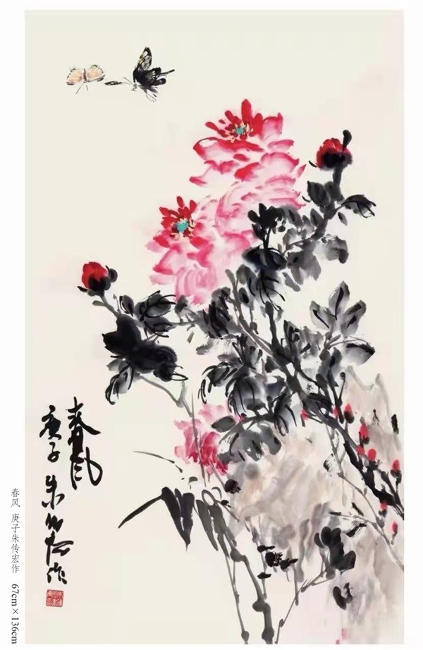 多年来,朱传宏在艺术天地勤耕不辍,对书法在写意花鸟画创作中的引领作用有着深刻的体会,凭借着扎实的书画基本功和娴熟的传统技法,将其对书法的体味与经验融入画中,笔的轻重、刚柔、浓淡、枯湿把控得非常得体。他的写意花鸟画以固守传统的诗书画印的整体和谐之美的营构思路为前提,体现了中国传统文化源远流长、博大精深,一脉相承之间,流淌着纯粹的文化气息。他固守传统文化却不墨守成规,勇于探索却不远离传统。他笔下的花鸟从容不迫、自然灵动。画面动静结合,清新感人,体现出中国文人画特有的有意、有趣、有风情且潇洒飘逸的艺术风格,也表达了现代都市人对恬静、平和、悠闲生活的向往与追求。