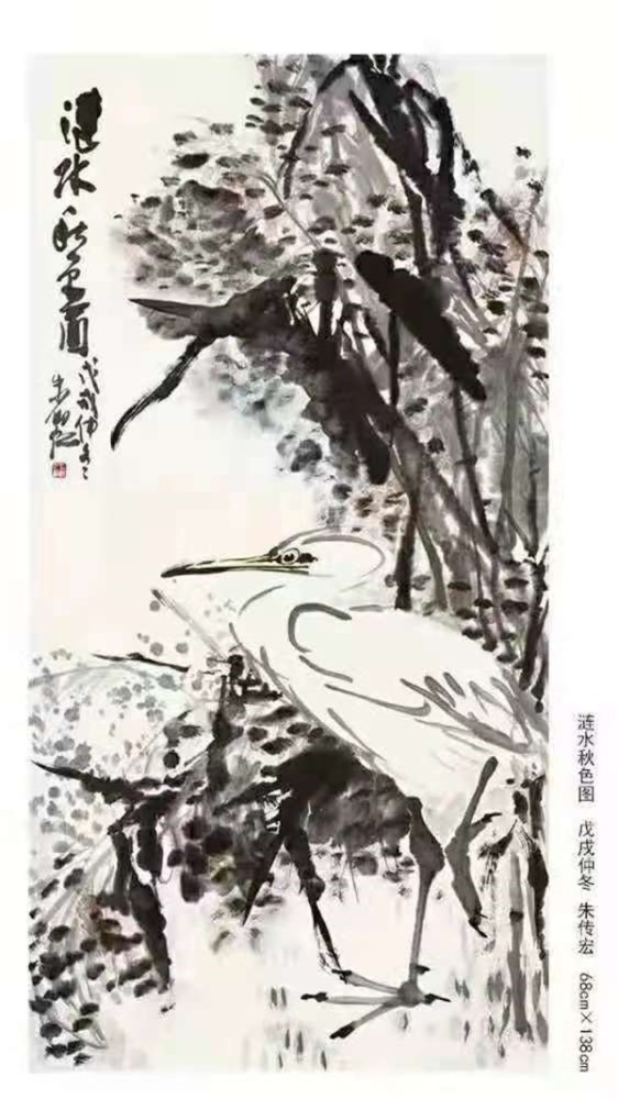 朱传宏定居山西省临汾市,游历过祖国的山山水水,见到各种各样美丽的风景,可是,在他心中,别处的风光再美,也美不过家乡的五岛湖,幼时初见五岛湖白鹭翻飞的场景已经成为他心里一幅绝美的水墨丹青画。他一直关注着家乡的发展,为五岛湖越来越美而高兴,为酒香越飘越远而自豪,为家乡人的生活越来越美好而欣慰。成绩和名誉的取得,离不开家乡风土的哺育,反哺家乡,朱传宏念兹在兹。2019年,朱传宏回涟水,在县文化馆举办“‘洗尽铅华 情系故乡’——朱传宏书画作品展”,吸引众多书画爱好者慕名前来观看。他向县文化馆捐赠了自己的作品《墨竹》,表达他的浓浓乡情。在这次活动中,经人介绍,朱传宏认识了在南京生活的涟水籍著名书画评论家左庄伟,并特意到南京拜见他。左老评价朱传宏的绘画作品,物性寓涵着人性,艺术形象充满生机、生动、活泼,鼓励他要秉承淮安人勤奋、好学的精神,多为家乡争光。