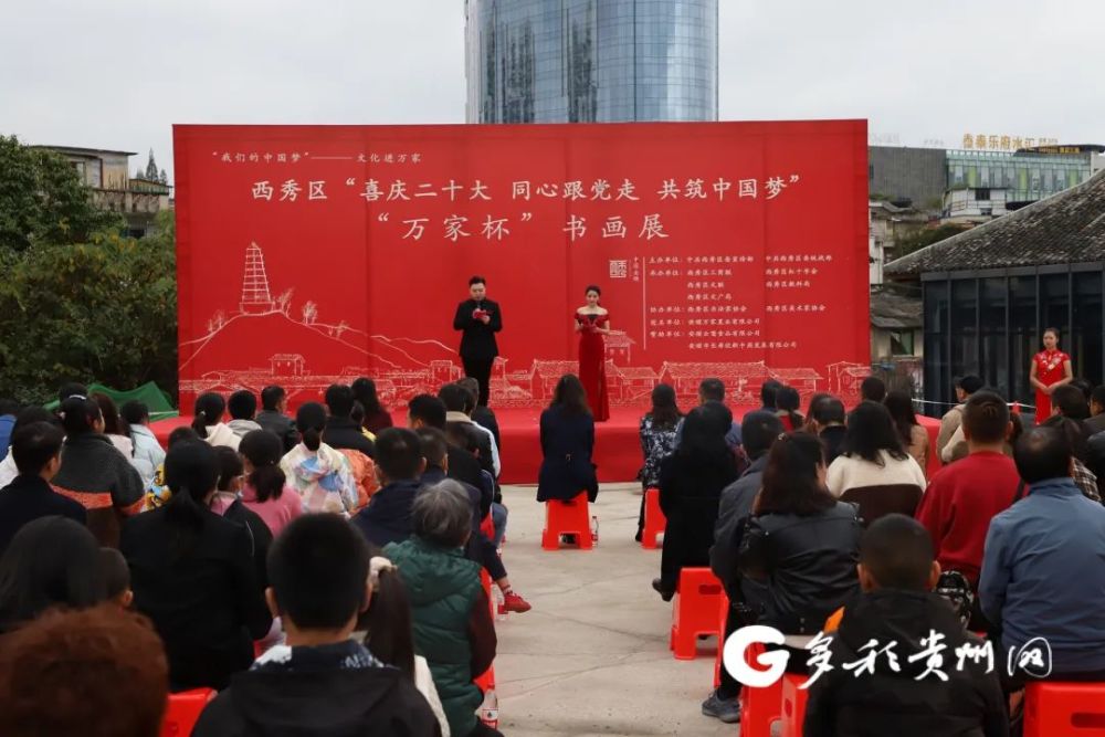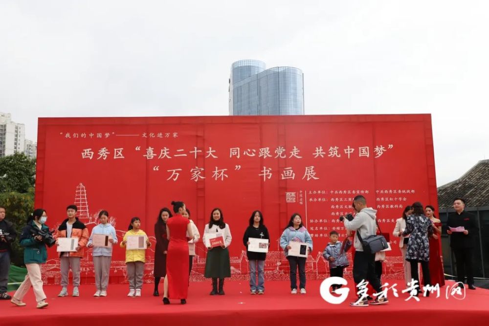 西部之秀,文艺飘香。10月30日,由西秀区委宣传部、区委统战部主办,区工商联、区文联、区红十字会、区教科局、区书法家协会、区美术家协会等多部门承办的西秀区“喜庆二十大 同心跟党走 共筑中国梦”“万家杯”书画作品展,在西秀区若飞广场安顺古城历史文化街举行。 据了解,本次书画展集中展示了160余件集思想性、艺术性、观赏性于一体的书画作品,作品彰显了该区书画家们为人民创作、为时代泼彩的艺术情怀,体现了该区文艺工作者们昂扬奋进的姿态和朝气蓬勃的精神面貌,展现了党的十八大以来西秀经济社会文化发展取得的辉煌成就。同时,书画艺术家们从不同视角,用多种表现形式描绘在中国共产党领导下,中国特色社会主义新时代的新面貌新成就,展示新时代全区上下干事创业、踔厉奋发的精神风貌,表达了全区人民爱党爱国的深厚情怀。 通过展览,唱响了主旋律,提振了精气神,绘就了一幅新时代西秀高质量发展的壮美画卷,为贯彻落实好党的二十大精神营造了良好氛围。 当天,还为多位获奖选手进行颁奖。