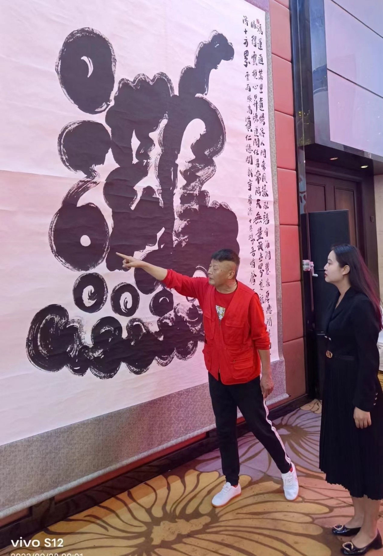 北京东方名家书画院院长、物象派书法创始人寒北星在“迎中秋、庆国庆74周年暨寒北星物象书法艺术展”活动现场向参加活动的领导介绍书法作品