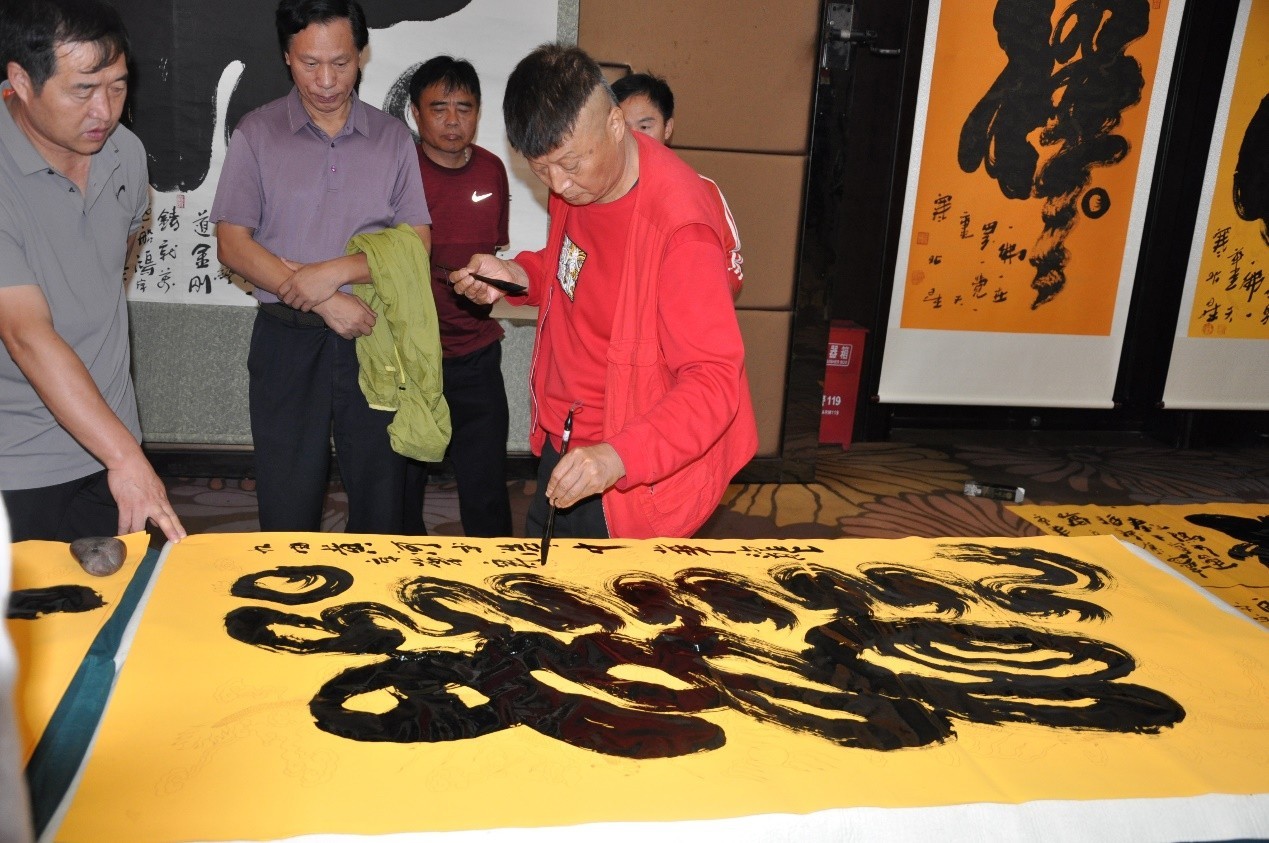 物象派书法创始人寒北星在“迎中秋、庆国庆74周年暨寒北星物象书法艺术展”活动开幕式上现场创作
