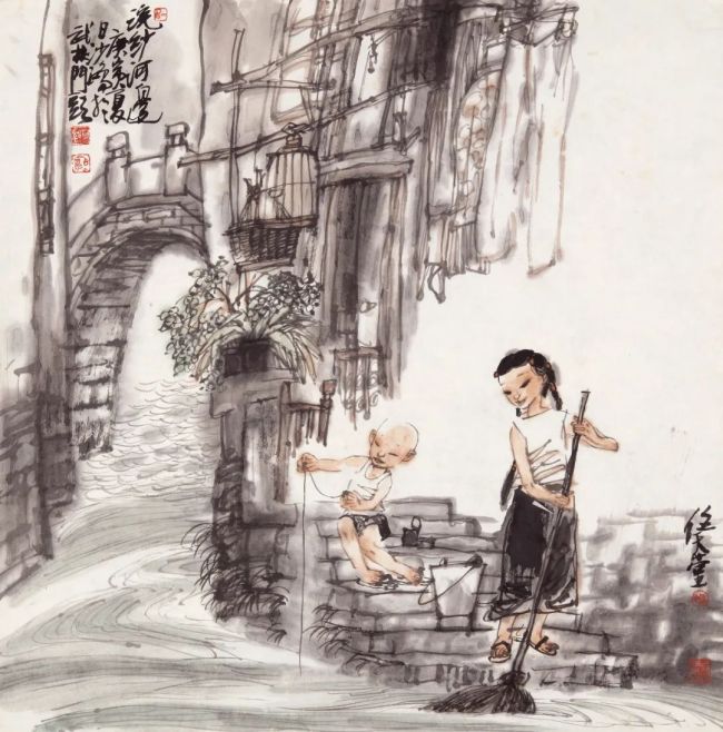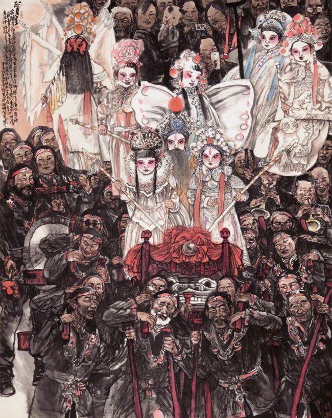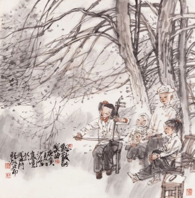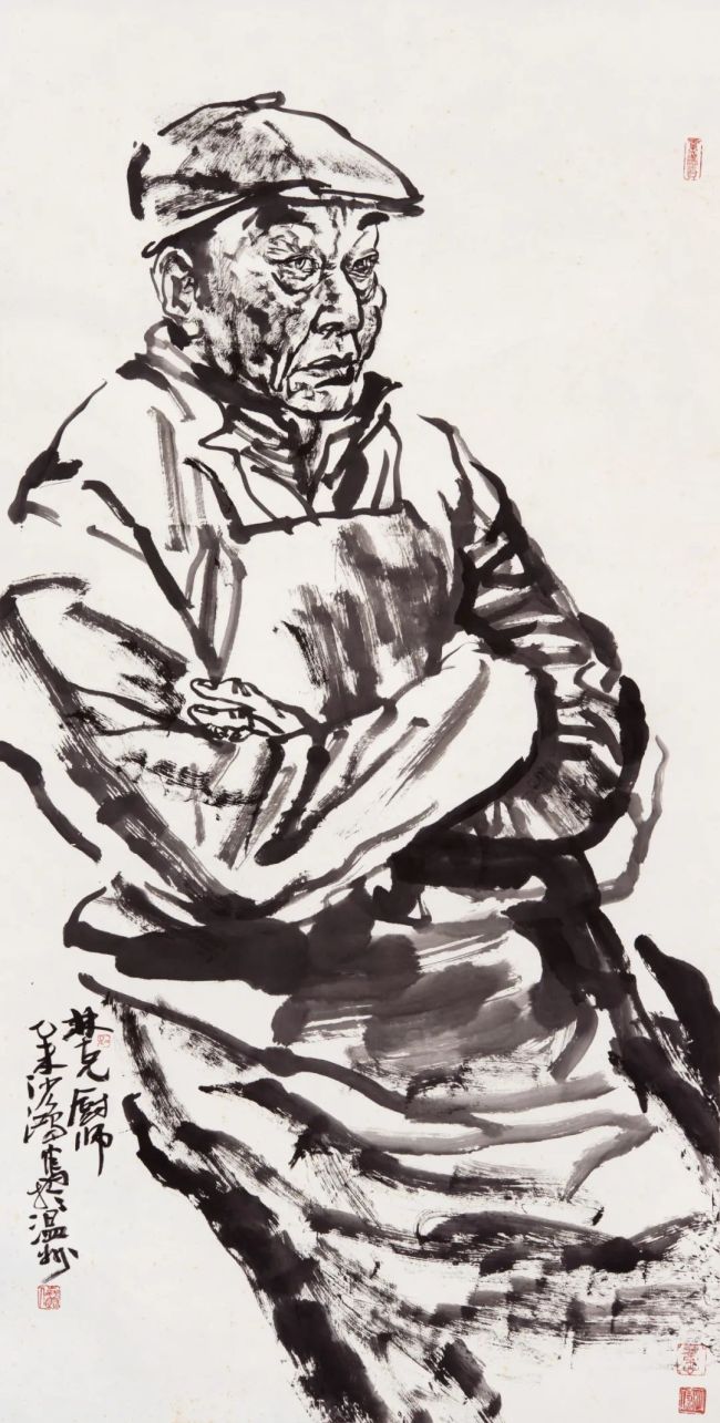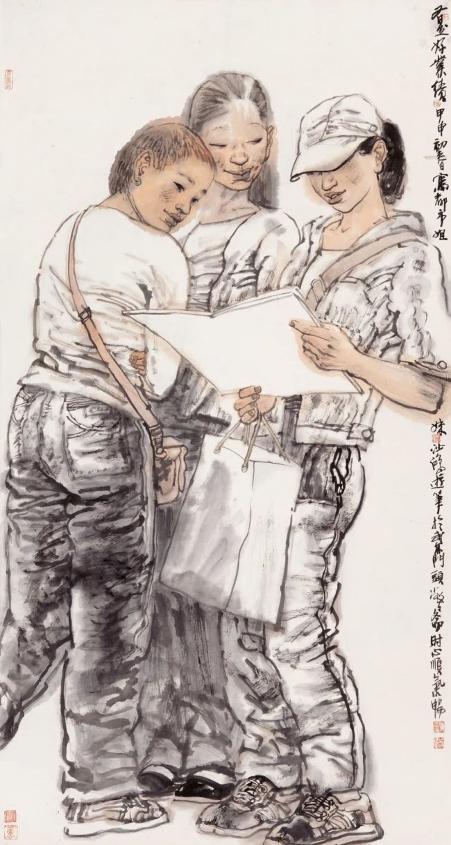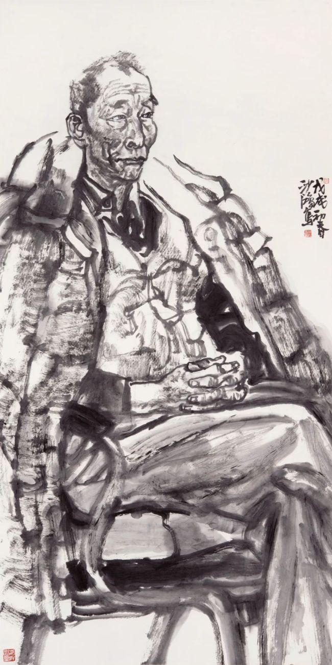 浙江美术学院(现中国美术学院)国画系77、78级,没有分人物、山水、花鸟专科,所以我只把分科当做油画中的静物、肖像、风景、风俗分类看待,作为画者,都须掌握。而且古人分科何止三科,今人创造的很多科技、工业、农业、交通、航天、能源、城市等万千成就均不在人山花三科内。所以,真正遵循谢赫“应物象形”的法度是画者最基本的能力。一般而言,画人物和动物的难度最大。尤其画人物,需要全力跟着对象的形象、感觉、内心、性格走,以形写神、形神兼备,甚至达到以神捉型的高度。人物画创作还需要关注环境、气氛、故事、年代、衣着、用具等,随时将花鸟画、山水画、佛道画、动物画、民间绘画等各方学来的技法揉碎了,融汇于意向表达中,随时将读书、读物、读人、读社会、读自然的感悟化作绘画语言,随时将长期书法学习中修得的书写习惯贯穿于绘画中。随着手中笔、墨、水的运行,让人物活生生地呈现出来。