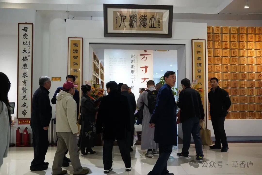 展览开幕当天,崇德堂博物馆展厅内观众络绎不绝,既有艺术界专家学者,也有众多书画爱好者与当地市民。大家或驻足细观篆刻印石上精微的刀法意趣,或凝神品味水墨画中虚实相生的气韵,或在书法作品前低声交流笔势节奏。整个展厅虽空间不大,却因艺术的凝聚和情感的流动,成为一个超越方寸的宏大精神道场。