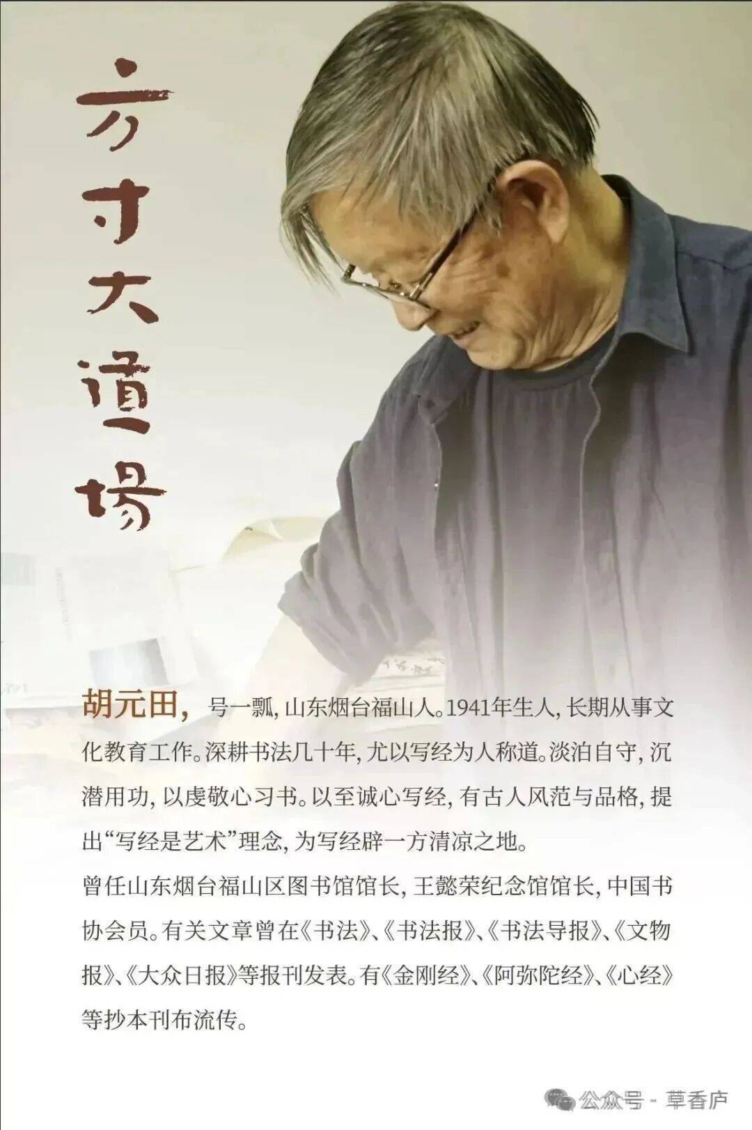 胡元田先生,号一瓢,山东烟台福山人,书法大家,深耕书法几十年,尤以写经为人称道。他淡泊自守,沉潜用功,以虔敬心习书,以至诚心写经,有古人风范与品格。其作品古朴典雅,览之一片静气,学养修为内蕴其中,使人安心静处,自生清凉。他提出“写经是艺术”,为写经辟一方清凉神圣之地,且以绵绵之力躬行不辍,为当代写经之仪范。