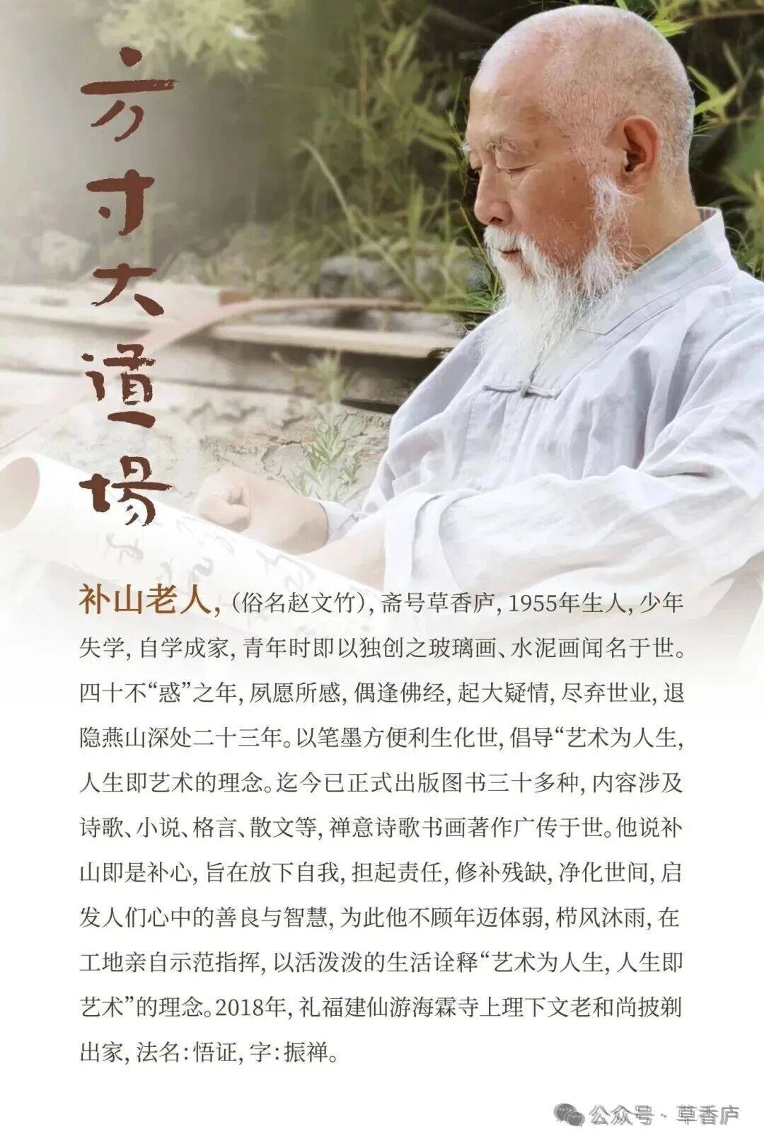 补山老人,原名赵文竹,法名悟证,早年以独创之玻璃画、水泥画闻名于世,四十不惑之年,夙愿所感,归隐燕山深处,依经参禅,得个休歇处。后以书画诗文化世,境界大开,出版著作数十部,书画格言被各方大量复制传播。他对材料有特别的感觉与驾驭能力,近年又相继创造了腐木画、拓彩瓷版画等特色画种,令人耳目一新。目前正致力于还童堡补山工程,助力乡村振兴。他说补山即是补心,旨在放下自我,担起责任,修补残缺,净化世间,启发人们心中的善良与智慧,为此他不顾年迈体弱,栉风沐雨,在工地亲自示范指挥,带动人们在火热的劳动中找回内心的喜悦和自在。上至老翁,下至孩童,无不欢喜参与,热情激发热情,智慧碰撞智慧,让小小还童堡成为善缘汇聚的乐园。