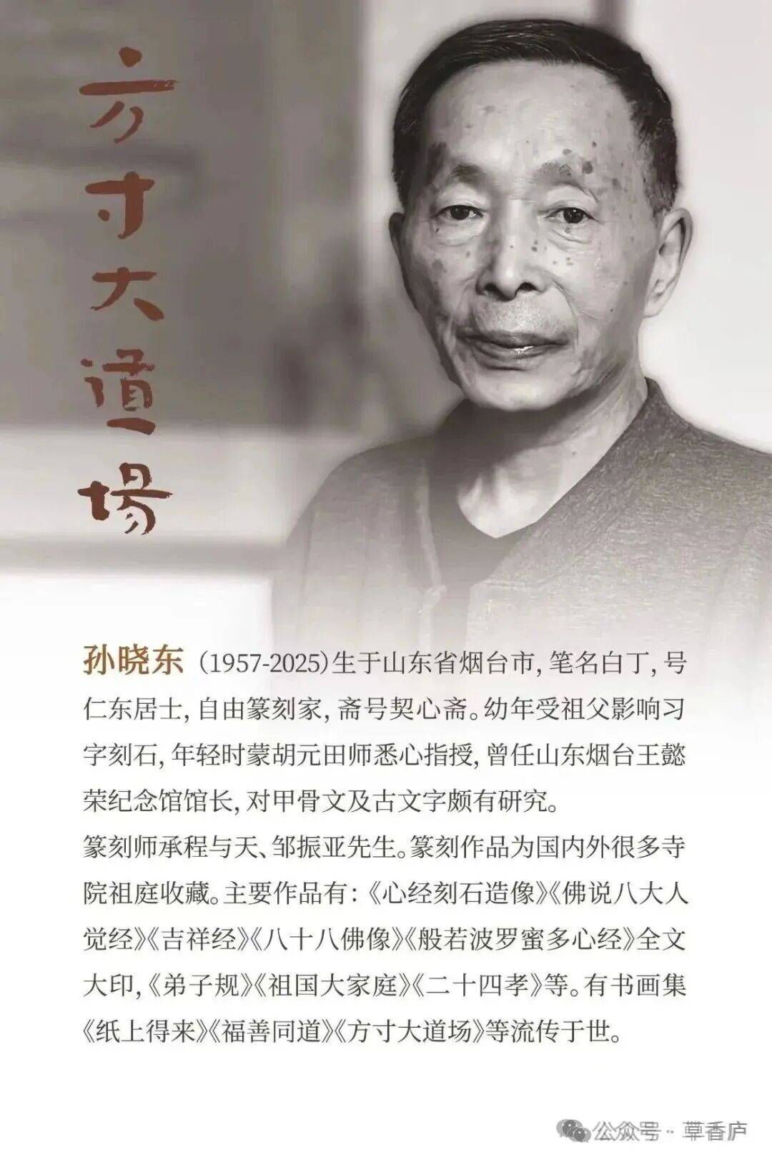 今天也是篆刻家孙晓东老师往生的七七之日,在这个特殊的日子里,我们怀着深深的思念与敬意,共同追忆孙晓东老师。孙老师一生以篆刻为修行,以刀为笔,以石为纸,其篆刻作品刀法精微、意蕴深长,令人感佩。在方寸之间镌刻对信仰的至诚、对生命的叩问,他的离去是中国篆刻艺术的一大损失,更是我们心中难以抚平的遗憾。此次画展是告别,也是纪念,这些作品不仅是对他艺术生涯的一次回顾,也成为了同道与观众寄托哀思、延续对话的桥梁。我们愿以这场“方寸大道场”,延续他的艺术生命,让他的作品继续在人间 传经布道。
